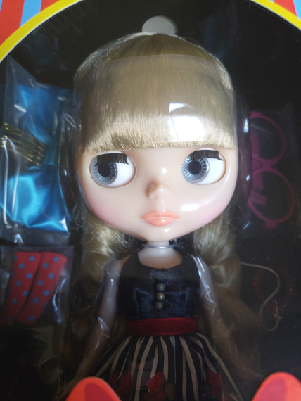 Final Design for “Miyuki Odani x Blythe” Collaboration Doll! CWC Limited Neo Blythe “Margo Unique Girl”! *FREE SHIPPING FEE* *Shipping address are subject to the address of your PayPal transaction. This spring, our newest collaboration girl will be released! Please take a look at this Miyuki Odani designed girl. Margo is your unique friend. When you have problem, you can consult with her and she will always give you great advises. She is cool and stylish. Her fashion matches well with her glasses. Margo’s one-piece looks simple but actually it’s full of complicate designs! Her top is made of neon black fabric decorated with gold beads. The halter-neck ribbon is black velvet and there is also a velvet red ribbon on the waist. Her skirt has a circus tent image full with humor and fun. Her over-skirt has black and beige stripes base with Margo’s initial “M” emblem (the initial frame is gold with red ribbon and small gold heart) printed. The skirt also has black lace on the rim. Her under-skirt is pannier like tulle. The fabric has small polka dot pattern and you can see it below her over-skirt. Margo’s most important fashion items are her glasses! She always wears vivid pink round glasses and black sunglasses. Her shoes and socks also have special designs too! She is wearing black tights with red x blue polka dot socks. Her shoes are 4 straps black shoes with red heels! For her hair, she has bangs but her hair is curly long hair which make she looks nice when she wears her glasses. Her hair color is light ash brown decorated with a big blue satin ribbon. Margo’s skin is our newest style! Her skin is half transparent fair (natural color) skin which looks different from our previous half transparent skin dolls. Her make-up is light brown eye shadow, newly designed lip shape in pink salmon and pink cheek. Her eye colors are one default pink and three special colors; light blue grey, light green and yellow. She also comes with gold and red stand. She also has a clear red pulling with gold glitters. Face type: radiance Skin type: Half transparent fair (natural skin) Make up: eye shadow: light brown/ lips: salmon pink/ cheek: pink Eye colors: light blue grey (left, special color), light green(center/ special color), yellow (right, special color) , pink (center). Hair color: light ash brown Earrings: no earring. Manicure: red. Whole set: doll, one-piece, hair accessory (ribbon), round glasses, sunglasses, socks, net tights, shoes, shorts and stand. Limited of 1000 dolls. We accept payment by PAYPAL, VISA and WESTERN UNION Thank you. Please don't hesitate to contact us at cctoyshop@yahoo.com.hk if you have any question about this product.