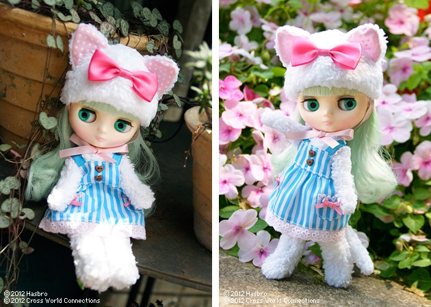 Hasbro Middie Blythe Doll Melomelomew Size : 8" *FREE SHIPPING FEE* *Shipping address are subject to the address of your Paypal transaction. Melomelomew our cute Middie kitten! She is the first Middie Blythe to have a kigurumi animal suit. Her cute animal suit comes has a sweet and fluffy tail! The light blue and white striped apron is so perfect. She loves cute things and dressing up pretty, which is why she has heart buttons, ribbon and lace on her sweet dress. Her animal suit has adorable little cat ears complete with pink polka dot pattern inside that adds to her charming look. Her mint green hair has soft, curly waves with bangs. She even has a matching mint green doll stand. Skin Type: Fair Make Up: Eyeshadow- light green, Lips- Pink, Cheeks- Pink, Eye Color- Mint Green Hair Color: Mint Green Set Contains: Doll, Animal Suit, Dress, Hat, Underwear, and doll stand. Release date: 10 August 2012 We accept payment by PAYPAL, VISA and WESTERN UNION Thank you. Please don't hesitate to contact us at cctoyshop@yahoo.com.hk if you have any question about this product.