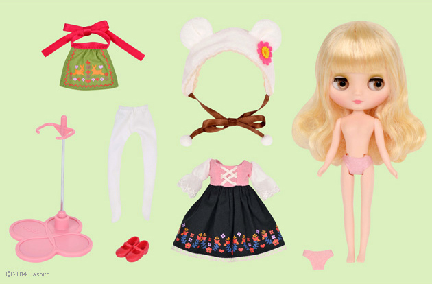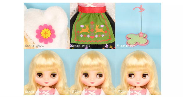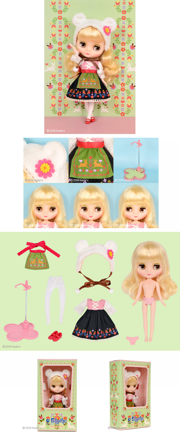 Middie Blythe “Oski tebyA lyublyU” is a special girl who lives in the forest with the bears *FREE SHIPPING FEE* *Shipping address are subject to the address of your PayPal transaction. "Living in the forest with the bears and nature is a lovely fantasy. I want to live there with Misha and Suri. We will share a happy life together." Oski is dressed in Northern European folk dress with cute motifs of animals and nature. The coordination of her dress, apron and ribbons gives this quant fashion look. Her blouse has puff sleeves with cute lace detail at the bodice. Her sweet skit has the traditional folk motif printing. This is accentuated by her sweet apron printed with rabbits and flowers. She wears a white fur bear hat with tiny lace around the edge and a lovely flower at the ear. With her cute bear hat she fits right in with Misha and Suri! To finish her look she has white tights and red strap shoes. She has a healthy glow to her with hr fair skin and soft make-up. She has long blonde hair set in a perm with bangs. Her final charm point is her soft, light brown eyes. Skin: Fair Make-up: yellow green eyeshadow, pink blush and lip. Eye Color: Light brown Hair Color: Blonde The set includes: Doll, dress, apron, bear hat, tights, shoes, underpants and stand. Release Date: September 19, 2014 We accept payment by PAYPAL, VISA and WESTERN UNION Thank you. Please don't hesitate to contact us at cctoyshop@yahoo.com.hk if you have any question about this product.