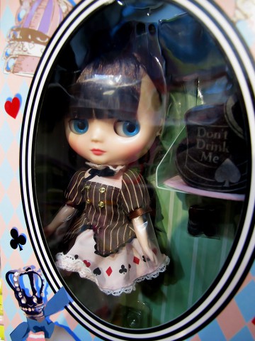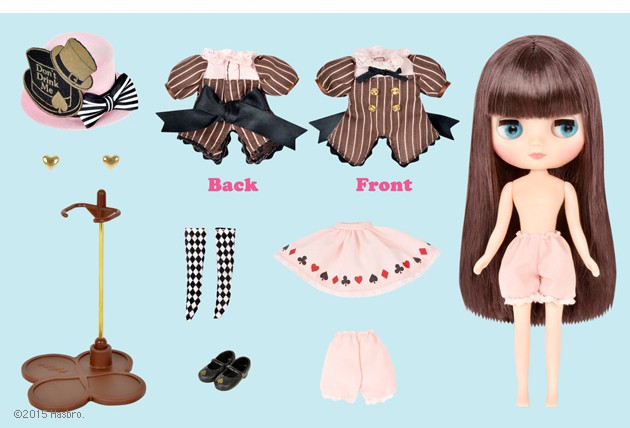 **Please note her outfit may have little mouldy / dusty from long storage.** The mouldy / dusty can be removed and no damage to it. Tea parties in Wonderland are always bizarre and exciting! Mary Ann final specifications *FREE SHIPPING FEE* *Shipping address are subject to the address of your PayPal transaction. I didn't think that I would shrink to a Middie size when I drank that potion, but now that I'm small, I can explore and have fun! Mary Ann's Fashion is based off of a playing card and hat motif, the quintessential Wonderland Style! Definitely a good look to take to a unique tea party! Her jacket like blouse is chocolate brown with pink pin stripes, four gold buttons, and a ribbon on her collar. Her skirt is a gathered strawberry pink miniskirt. The skirt is decorated with hearts, spades, diamonds, and clovers, along with a lace fringe. Her drawers are made long, so that it will peek out cutely under the skirt. Her hat has "Don't Drink Me" written on it, presumably the message that was on the bottle that she drank out of. Her socks are printed with a monotone diamond pattern, and the toes of her black shoes are gilded in gold. Her hair is straight and long with bangs, and her hair color is a reddish dark brown. Her eye shadow is light purple, and her cheeks and lips are a healthy pink. Face type: Middie Blythe Skin type: Cream Make up: Eyeshadow- light purple / Lips, cheeks- pink Eye color: Light blue Hair color: Reddish dark brown Manicure: n/a Ear rings: heart shaped Eye lids: default Set: Doll, blouse, skirt, hat, ear rings, socks, shoes, shorts, stand. Available: Nov. 13th, 2015 (Fri) We accept payment by PAYPAL, VISA and WESTERN UNION Thank you. Please don't hesitate to contact us at cctoyshop@yahoo.com.hk if you have any question about this product.