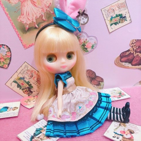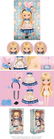 Come Join our Secret Tea Party! Middie Blythe “Pebble Cake and Shrinking Alice” Final Specs! *FREE SHIPPING FEE* *Shipping address are subject to the address of your PayPal transaction. This world is filled with wonders! Was it because I ate the pebble cake or because I drank the drink? I'm all small! Why not enjoy this wonderful tea party until I turn back to my normal size? Now, eat up this delicious cake! Pebble Cake and Shrinking Alice's most prominent features are its apron dress and rabbit ear hair dress. The dress uses a glossy blue fabric with box pleated lining at the end. The chest is lined with a shiny organdy fabric. The dress is covered in Wonderland chic designs, from a diamond design backing, roses, a teapot, a rabbit, a cat, a top hat, playing cards... everything that evokes the world of Alice! The headdress is a very important point. The pocket watch and ribbon detail are sure to draw eyes at any tea party! They can also be taken off, turning them into a simple black headdress. The gold heart earrings, bordered high kneesocks, and strap shoes complete the Alice look. Her face color is a translucent cream. Her hair is blonde, cut straight across the bangs. Her eyeshadow is brown, cheeks pink, and lips a blurred pink with a line drawn in the corners of the mouth. Face Type: Middie Blythe Face Color: Translucent Cream Makeup: Brown eyeshadow, blurred pink lip with a drawn in line in the corners of the mouth, pink cheeks Eye Color: Light blue Eyelid: Default Eyelash: Brown with a default shape Hair Color: Blonde Earrings: Heart shaped Manicure: N/A Set Includes: Doll, dress, headdress, earrings, socks, shoes, shorts, and stand Release date: March 30, 2018 (Fri) We accept payment by PAYPAL, VISA and WESTERN UNION Thank you. Please don't hesitate to contact us at cctoyshop@yahoo.com.hk if you have any question about this product.