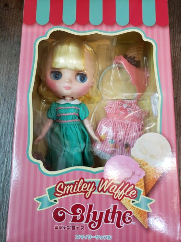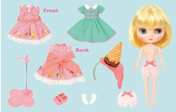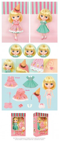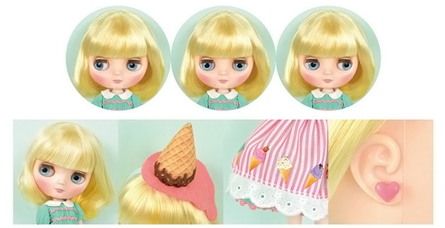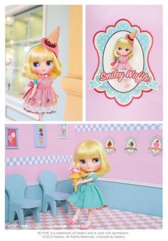 Hasbro Middie Blythe doll Smiley Waffle Come to my Ice Cream Shop! Middie Blythe Smiley Waffle Final Specs! *FREE SHIPPING FEE* *Shipping address are subject to the address of your PayPal transaction. When you come to my ice cream shop, there's bound to be a flavor that'll be your favorite! Bring a friend and have fun! My dream is to see off every customer with a smile on their face. Smiley Waffle's fashion is based on parlor uniforms. The mint green dress is paired with a smock embroidered shearling, white collars, and wave bladed skirt. The apron is pink and white striped with a colorful picture of ice cream on it. Her accessories are all bespoke, from the sprinkle topped waffle cone and ice cream head accessory and heart earrings, tri-folded socks, and pink strap shoes. Simple yet satisfying! Her face color is fair, with a short bob hairstyle that is lightly permed. The hair is a very special two-tone color, yellow in the interior and light yellow in the exterior. The eyes are light blue, and the eyelashes are brown. Face Type: Middie Blythe Face Color: Fair Makeup: Brown eye shadow, Pink lip, Pink cheek Eye Color: Light blue Eyelid: Default Eyelash: Default shape, brown Hair Color: Yellow interior, light yellow exterior Earrings: N/A Manicure: N/A Set Includes: Doll, dress, apron, headdress, earring, socks, drawers, strap shoes, and stand (17.5 cm) Release date: February 22nd, 2019 (Fri) We accept payment by PAYPAL, VISA and WESTERN UNION Thank you. Please don't hesitate to contact us at cctoyshop@yahoo.com.hk if you have any question about this product.
