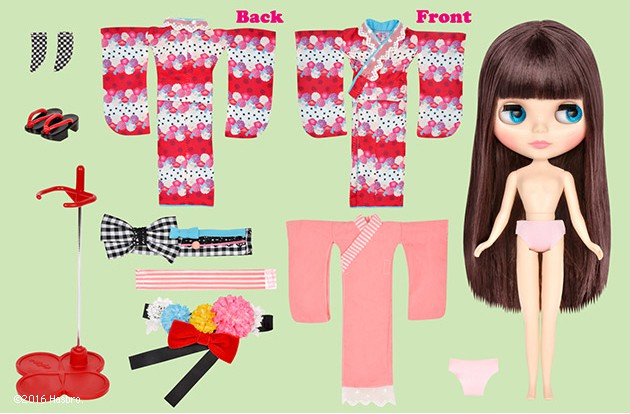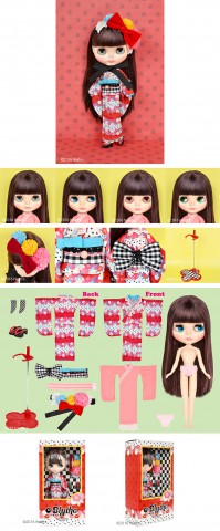 Neo Blythe doll Kimono Lady Camellia *FREE SHIPPING FEE* Stroll through the night in a Kimono moderno. Final specs for Neo Blythe Lady Camellia are here! Wearing a kimono is wearing modesty. Like customs stemming from ancient traditions, to accessories and tools that represent the changing seasons, the way they're worn changes the way it's seen. Lady Camellia's kimono style is defined by the camellia patterned fabric that is used in her outfit. The cute, almost polka dotty camellias are juxtaposed by the light blue inner lining. The obi is a monochrome gingham pattern tied in a bow. The kimono is completed with black lace, an obi decorated with flower beads, and a blue obijime. Her under kimono is a pink nagajuban underwear with laced sleeves detailed with a striped collar, and a clip-on obi worn like a belt. The modern aspect is enhanced by a flower motifed lace layered with a tri-color flower, and a red velvet ribbon, a head dress tied below the chin, and a checkered pair of socks with a black pair of sandals. Her make up compliments her dark purple-ish brown hair, with brown eye shadow, along with salmon pink cheeks and lips. Her front facing eyes have one special light blue color. Her face type is Radiance+ and her face color is cream. 【Facetype】 Radiance+ 【Skintype】 Cream (Fair) 【Make up】 Eyeshadow:Brown / Lips:Salmon Pink / Cheeks:Salmon Pink 【Eye color】Lightblue (front/Special color), Blue (Right Facing), Pink(front), Green(left) 【Hair color】Purple-ish Dark Brown 【Eye lids】default 【Eye lashes】default 【Set includes】Doll, kimono, obi, nagajuban (slip), clip on obi, head dress, socks, sandals, shorts, stand Release Date:April 15th, 2016 (fri) We accept payment by PAYPAL, VISA and WESTERN UNION Thank you. Please don't hesitate to contact us at cctoyshop@yahoo.com.hk if you have any question about this product.