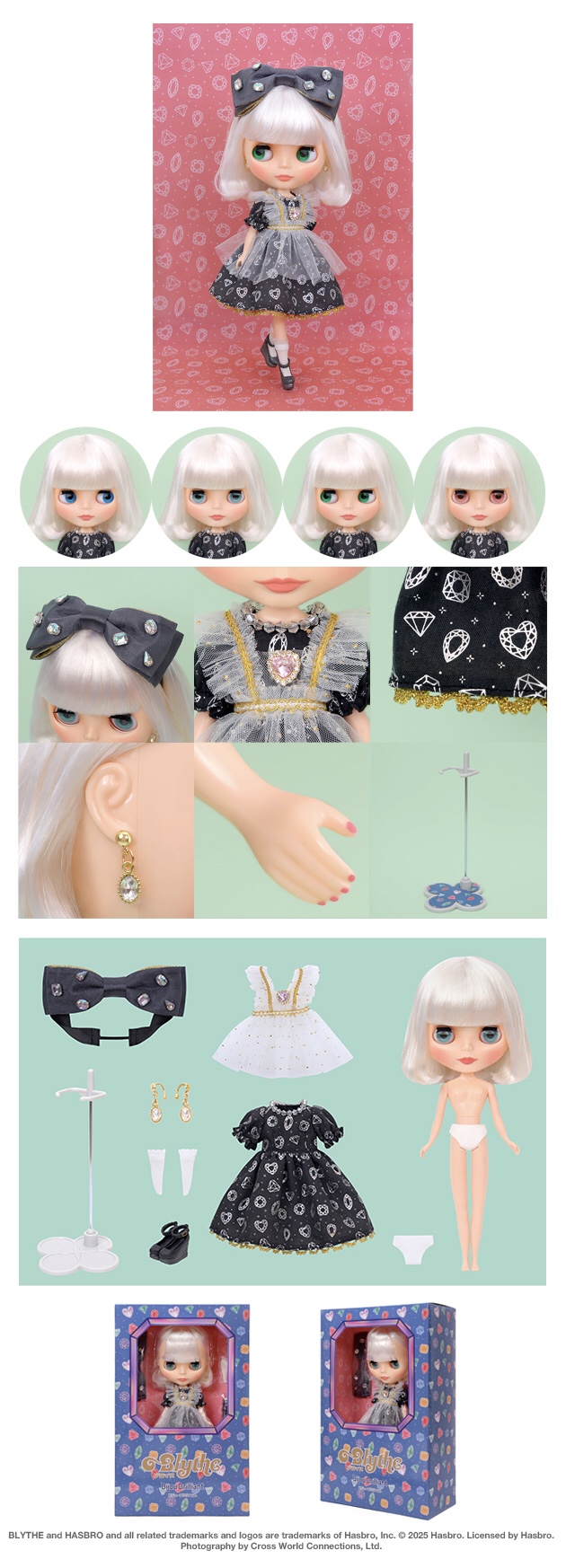 Neo Blythe “Bijou Brilliant” Final Specs! *FREE SHIPPING FEE* *Shipping address are subject to the address of your PayPal transaction. I love sparkling gems. They make me feel pretty and special, especially when I wear them. From diamonds to rubies and emeralds to sapphire, I can't live without these precious stones. The bijou makes my wardrobe shiny and that makes me happy. A dazzling fashion look that sparkles like a treasure chest of gems! The dress features an illustration of glittering bijoux, printed with aurora foil that shimmers like real gemstones. Inside the skirt, soft tulle adds volume, creating a gentle, flared silhouette that’s full of charm. The headband is a showstopper—two different fabrics layered into a ribbon shape, topped with a big, sparkling bijou for a glamorous touch. The tulle apron is sprinkled with gold polka dots and has a sweet heart-shaped bijou at the chest for extra sparkle. To finish the look, metallic gray strap shoes and short tulle socks add just the right touch of elegance and shine. ✨ Face Type: Radiance Evolution Face Color: Fair Makeup Eyeshadow: Light Brown Lip: Coral Pink Blush: Pink Eye Color: Blue (right), Blue Green (front *special color), Green (left), Pink (front) Eyelid: Default Eyelashes: Default/Black Hair Color: Yellowish white Piercing: Hook type / Clear bijoux Manicure: Dusty Pink Set Contents Doll, Dress, Apron, Hair band, Socks, Pants, Shoes, Stand (waist holder) We accept payment by PAYPAL, VISA and WESTERN UNION Thank you. Please don't hesitate to contact us at cctoyshop@yahoo.com.hk if you have any question about this product.