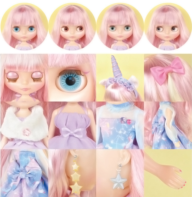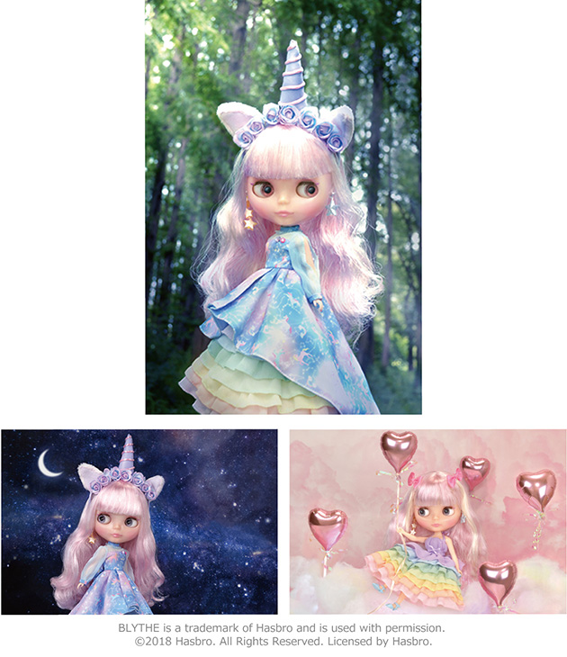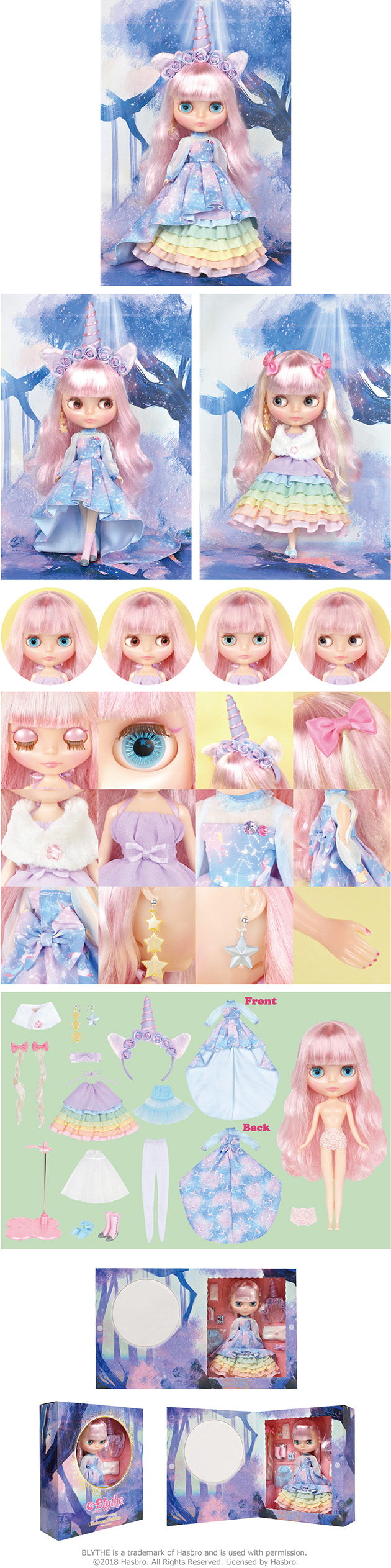 CWC Exclusive 17th Anniversary Neo Blythe Unicorn Maiden Final Specifications! *FREE SHIPPING FEE* *Shipping address are subject to the address of your PayPal transaction. This years anniversary doll is based on the elusive and glorious Unicorn, a magical creature that only opens its heart to pure souls. Unicorn Maiden's fashion is pure fantasy, her horn hair accessory and night sky dress is the main focus of her outfit. She lives deep in her forest, and unbeknownst to the world, casts miracles and happiness into the air so that it can land on those deserving of it. Her magical dress that shows her powers can also be arranged into formal, casual, and girly looks! Her overdress has a short front and long fishtail backend, and her pastel tiered skirt can be worn by itself or taken off for a variety of different looks. Wear the entire dress for a formal look, or wear just the tiered skirt and her boots for a change! The tiered skirt can even be worn as a dress itself. Switch it up by wearing just the frilly dress, the fur cape, and hair extensions too! The asymmetrical ear piercings, ribbon belt, mesh tights, strap shoes and middle boots, hair extensions, and other fashion accessories complete the look! Her face type is Radiance Renew, and her face color is a translucent cream. Her hair color is a brand new purplish pink (that comes with a pair of white extensions). Her hair is long, slightly permed, and cut straight across the bangs. Her make up is youthful and lovely. Her eye shadow is pink, with the lower part of the eye hole highlighted pearl white, and a thin purplish pink eyeliner drawn along the edges of the eyes. Her eyelids are a pearl pink, and her eyelashes are a special light brown. The eye chips are all special! Starting with a light blue with embedded holograms, it continues with a light pink, a light blue with stars printed, and a light pink. Her cheeks are pink, and her lips are blurred pink with a lining in the corners of the mouth. Face Type: Radiance Renew Face Color: Cream (Translucent) Makeup: Pearl Pink eye shadow (pink-purple eyeliner around the edges, with white highlights at the bottom of the eyehole), pink lips with the edges blurred, pink cheeks Eye Color: light blue(front, with hologram), light pink (right), light blue (front, with star prints), light purple (left) *All special colors Eyelid: Pearl pink Eyelash: Light brown *special color Hair Color: Purplish pink Earrings: A pair of silver and yellow star earrings Manicure: Pink Set Includes: Doll, dress, overdress, belt, cape, socks, hat, hair extensions, earrings, tights, pannier (short, long), and dress stand (14 cm) Available August 4th, 2018 (Sat) We accept payment by PAYPAL, VISA and WESTERN UNION Thank you. Please don't hesitate to contact us at cctoyshop@yahoo.com.hk if you have any question about this product.