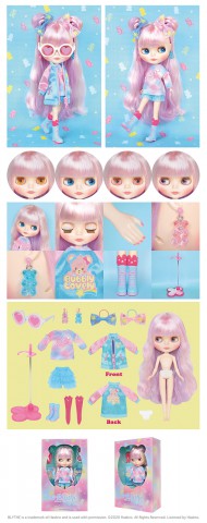 Neo Blythe “ Sweet Bubbly Bear” Final Specs! *FREE SHIPPING FEE* *Shipping address are subject to the address of your PayPal transaction. Sweet Bubbly Bear is my dearest friend! His cute little eyes bring a warmth to my heart, and I love to hug his soft and fuzzy body! Sweet Bubbly Bear's fashion consists of bears, hearts, and stars, all contained within a pink/blue color scheme. She wears a Blythe logo pastel gradation top and a pair of short pants with a blue tulle lace layer. The sleeves and the back of her satin jacket are a different color and has shooting star and Bubbly Bear details. Her accessories include a pair of hair bands with ribbon and star beads, a pair of white-framed sunglasses, and short boots with pink shoelaces and soles. Her face type is Radiance Renew, and her face color is cream. Her hair is cut straight across the bangs and is lightly permed, with a pink outer layer dye and purple inner layer dye. Her eye shadows are brown, cheeks are pink, lips a puffy clear pink, and her eyelashes are brown. A special light purple color is set on her left facing eye chips. Face Type: Radiance Renew Face Color: Cream Makeup: Brown eye shadow, puffy pink lip, pink cheek Eye Color: Orange (front), blue (right), pink (front), light purple (left, special color) Eyelid: Default Eyelash: Brown Hair Color: Purple and pink two toned color Earrings: Bear earrings Manicure: Pink Set Includes: Doll, top, short pants, jacket, 2x hair bands, earrings, sunglasses, socks, shoes, shorts, stand Release date: 21st February 2020 We accept payment by PAYPAL, VISA and WESTERN UNION Thank you. Please don't hesitate to contact us at cctoyshop@yahoo.com.hk if you have any question about this product.