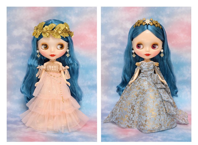 CWC Exclusive 21st Anniversary Neo Blythe “Juno Estella” *FREE SHIPPING FEE* *Shipping address are subject to the address of your PayPal transaction. Venus, goddess of the heavens, twinkles in the pink morning sky. At night the stars in the universe gather together to remind us of the infinite possibilities of tomorrow. It's time to make a wish for all of us, upon the stars. Venus at Dawn Style Pink Dress The combination of pink tulle and gold fabric is beautiful in this long dress. The gold braid on the top, ribbons on both shoulders, and pink cut beads scattered on the tulle skirt express tenderness. Pearl and star motifs are used for the chain belt that accentuates the dress. The head accessory is a crown with gold-colored flowers and leaves that looks beautiful against the ink-blue hair. Evening Star Style Blue Dress This fantastic long dress is made of blue chiffon fabric with gold silk print all over. The asymmetrical draping and folded ribbon-like decorations hanging from the waist give the dress an elegant design. The shoulders of the long cape are adorned with gold curly roses. Head accessories coordinate with the new tiara, which is designed with a scattering of stars★. For accessories, we selected items with gold as the key color that would go with both fashions! Necklace and earrings designed with pearl and star motifs, tulle petticoat, and net tulle high socks with gold picot lace trimmed at the opening, and gold pumps. The face type is Radiance Evolution and the face color is translucent cream. Hair color is Ink Blue, a new color, and hairstyle is long hair with a center parted perm. Makeup is done in an elegant image. The eyeshadow is light brown, the lips are a clear reddish burgundy with gloss, and the blush is pink. The eyelids are light brown (molded color), the same color as the eye shadow, and the eyelashes are special black. All eye colors are set in special colors! Blue-green (front), light brown (right), blue (front), purplish pink (left). Nails are pink. Eye change charms are star motifs. The support and base of the stand are clear and gold, and the prop is gold-colored. Face Type: Radiance Evolution Face Color: Translucent cream. Makeup: Eye shadow: light brown, Lip: wine red (clear type plumping mask), Blush: pink Eye Color: blue green (front), light brown (right), blue (front), pink (left) *All special colors Eyelid: Light brown (molded color) Eyelashes: Special spec black (long eyelashes) Hair color: Ink blue *New color Earrings: Pearl and star motif Manicure: Pink Set includes: Doll, dress (pink and blue), cape, leaf crown, star-shaped tiara, necklace, earrings, chain belt, and a star-shaped tiara, shorts, socks, shoes, short stand (approx. 13 cm high) Release date: 30 September 2022. We accept payment by PAYPAL, VISA and WESTERN UNION Thank you. Please don't hesitate to contact us at cctoyshop@yahoo.com.hk if you have any question about this product.